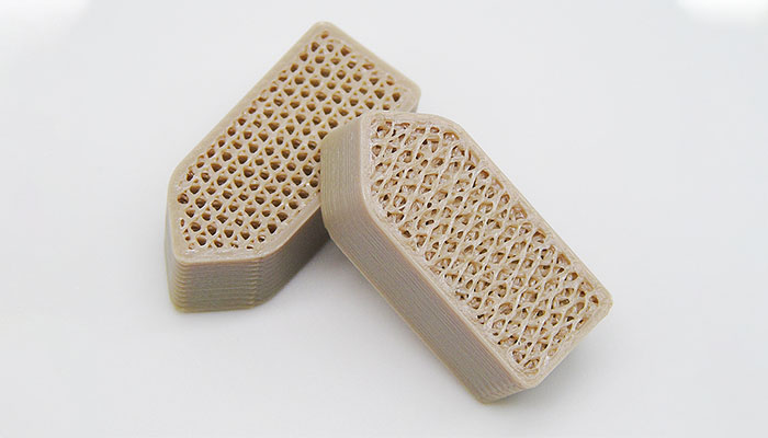 Il PEEK è probabilmente il più comune tra i filamenti per stampanti 3D in questa categoria. Appartenente alla famiglia del PAEK, richiede una temperatura di estrusione di circa 400°C (752°F), un piatto in grado di raggiungere 230°C (446°F) e una camera calda a 120°C (248°F). Il PEEK è noto per il suo rapporto peso/resistenza e può sopportare elevate temperature. Può essere sterilizzato, cosa che lo rende il materiale preferito per la stampa di impianti personalizzati. Si tratta di un filamento per stampanti 3D piuttosto costoso e che richiede inoltre una certa padronanza del processo di stampa 3D.