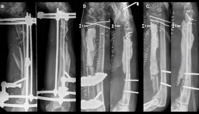 Bei dem im Oktober 2023 durchgeführten Eingriff ging es um die Rekonstruktion eines 14 cm langen Knochendefekts am Radiusschaft. Dieser lange Knochenabschnitt erstreckt sich vom Hals bis zum Tuberculum radialis, einem bedeutenden Teil des Arms. Vor der Behandlung in der Medizinischen Hochschule Hannover war der Patient bereits elfmal operiert worden, um die Wunde zu schließen, aber der Bruch war nur mit einem Ringfixateur stabilisiert worden, da die Größe der Verletzung ein Problem darstellte. Der letzte Schritt war die Integration dieses Knochenersatzgerüstes, das so konzipiert ist, dass es vom Körper wieder aufgenommen werden kann.