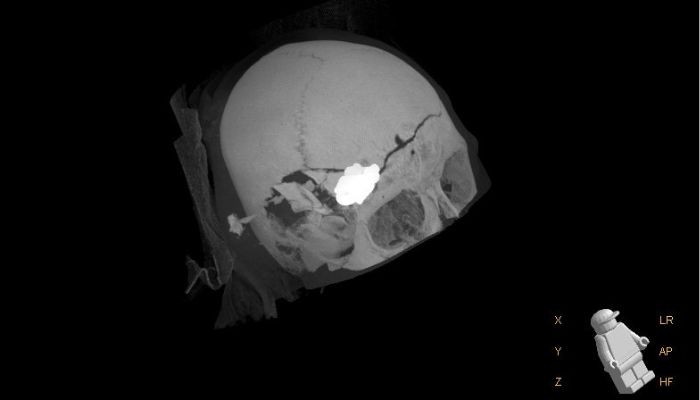 Das CT-Bild zeigt das rund 5 Zentimeter große Metallstück im Schädel von Felix. (Bild: SALK)