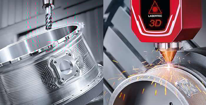 Die von der japanischen Firma MAZAK hergestellte INTEGREX i-400 AM ist eine hybride Multitasking-Maschine, die additive Fertigungstechnologie und hochpräzise Endbearbeitungsvorgänge für die Großformatfertigung bietet. Die AM-Technologie basiert auf dem Directed Energy Deposition (DED)-Verfahren. Die Düse trägt das geschmolzene Metall Schicht für Schicht auf, um das Teil herzustellen. DED ist interessant für Reparaturanwendungen von verschlissenen oder beschädigten Komponenten wie z.B. Turbinenschaufeln in der Luft- und Raumfahrt. Im Hinblick auf ihre Multi-Tasking-Fähigkeiten bietet die INTEGREX i-400 AM eine vollständige 5-Achsen-Bearbeitung zur Bearbeitung prismatischer Teile aus massiven Knüppeln oder Gussteilen, runder Teile, stark konturierter Teile und AM-gefertigter Teile.