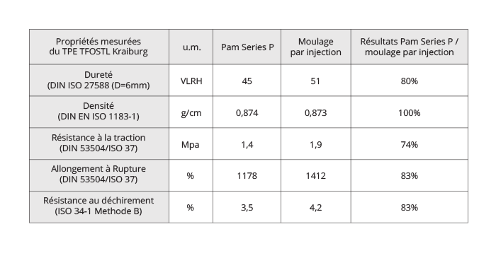Comparaison entre des éprouvettes imprimées avec la technologie Pam et injectées. Les éprouvettes imprimées développent des contraintes et des allongements similaires
